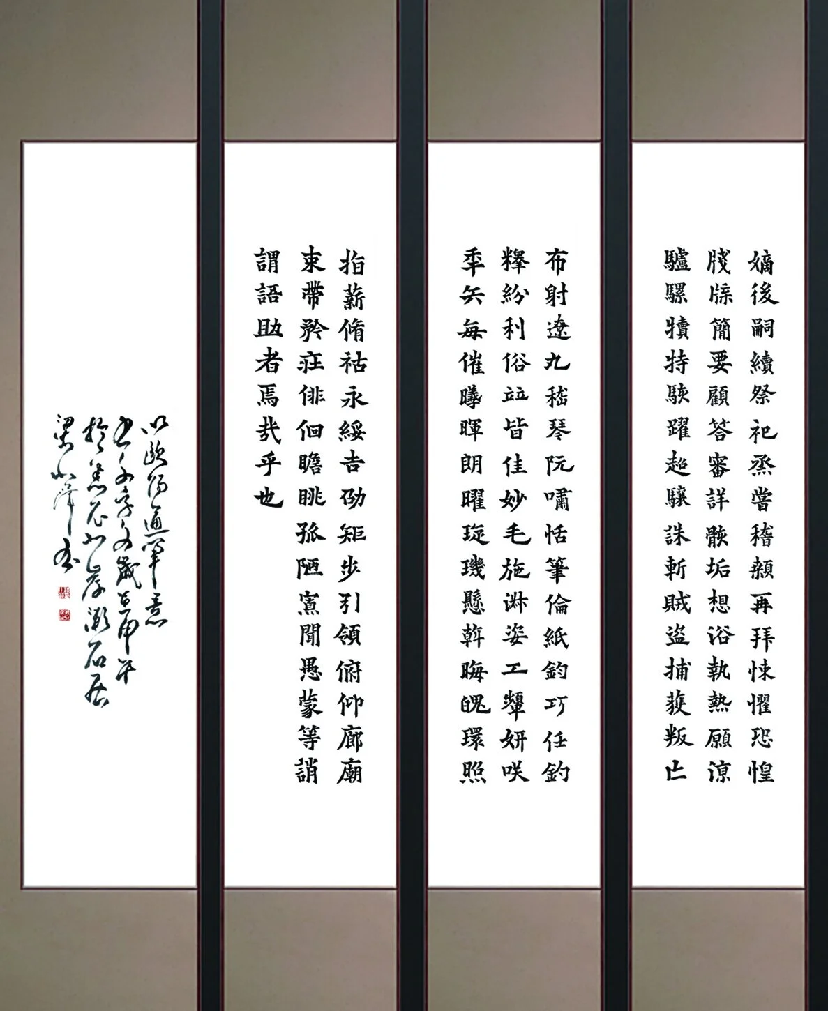 出于避免与其它楷书大家在历史上已有《千字文》书法重复的考虑,碑林在此选用了作者上面四款《千字文》系列。从该碑林《千字文》楷书系列中,可以较多地感受到作者梁氏自创笔法的应用,以及一窥作者在篆书、隶书作品中所呈现的淳厚之风和刀刻之力的根源。