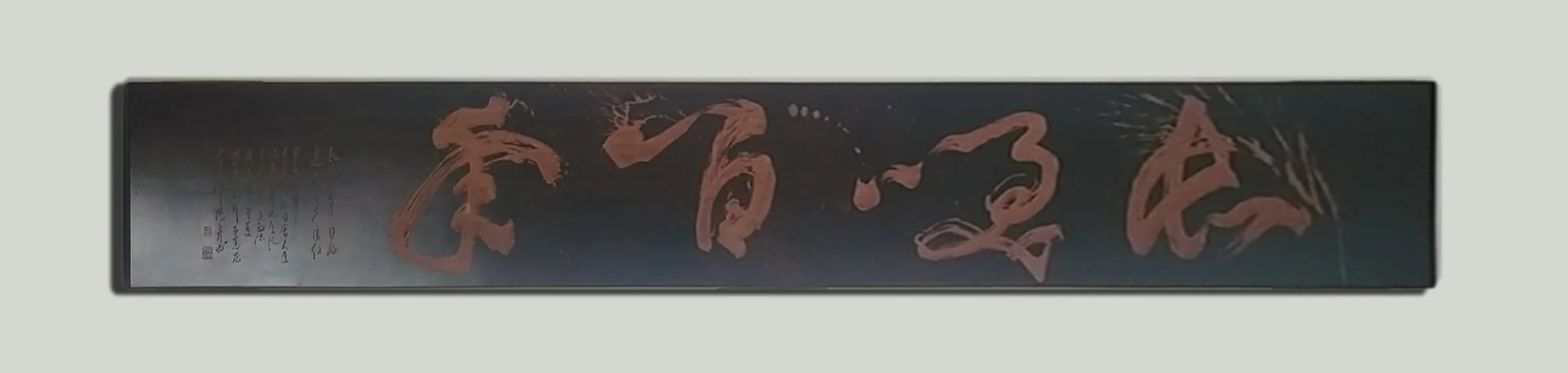 ⑷ 木雕巨作《长笑百年》,由“水墨芭蕾”与自撰回文对联的传统行书组成,其原作是2014年澳洲联邦国会大厦举办“冲天之飞-梁小萍自撰诗联书法艺术展览暨 梁小萍女史执管五十周年庆典”的中心展品之一。