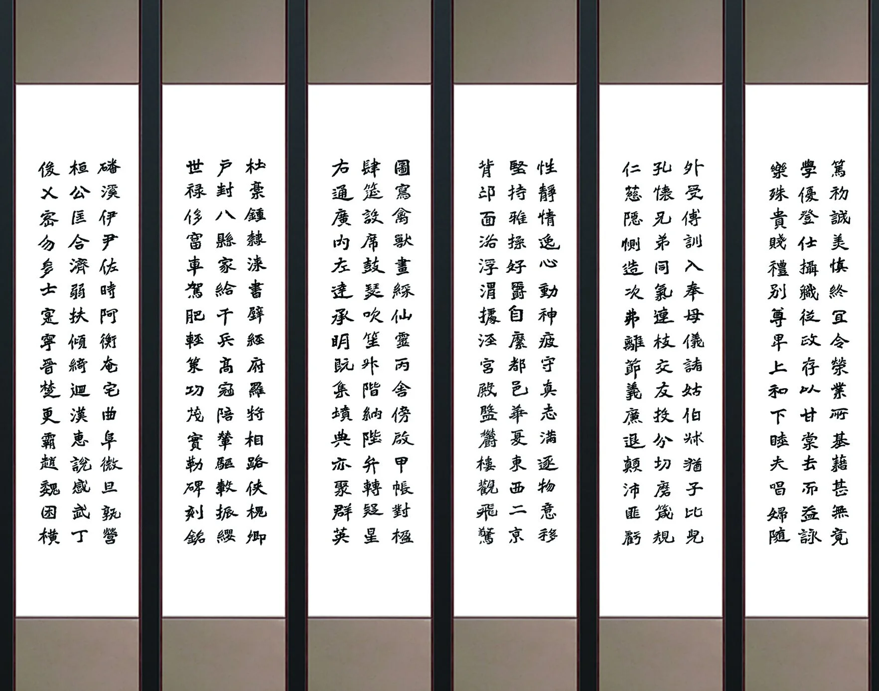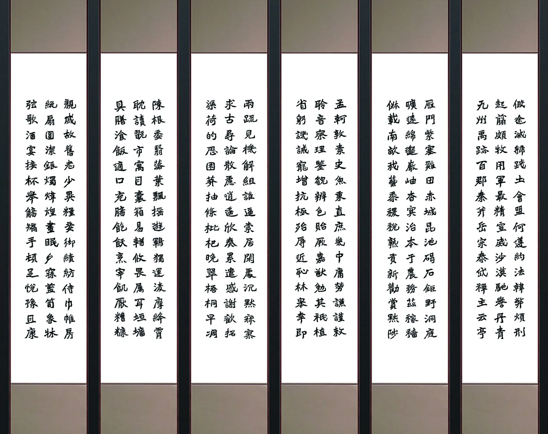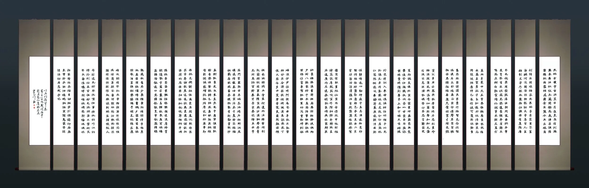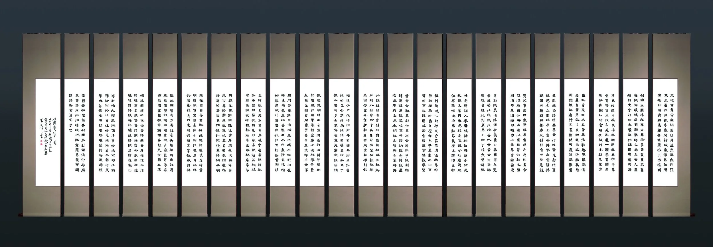 出于避免与其它楷书大家在历史上已有《千字文》书法重复的考虑,碑林在此选用了作者上面四款《千字文》系列。从该碑林《千字文》楷书系列中,可以较多地感受到作者梁氏自创笔法的应用,以及一窥作者在篆书、隶书作品中所呈现的淳厚之风和刀刻之力的根源。