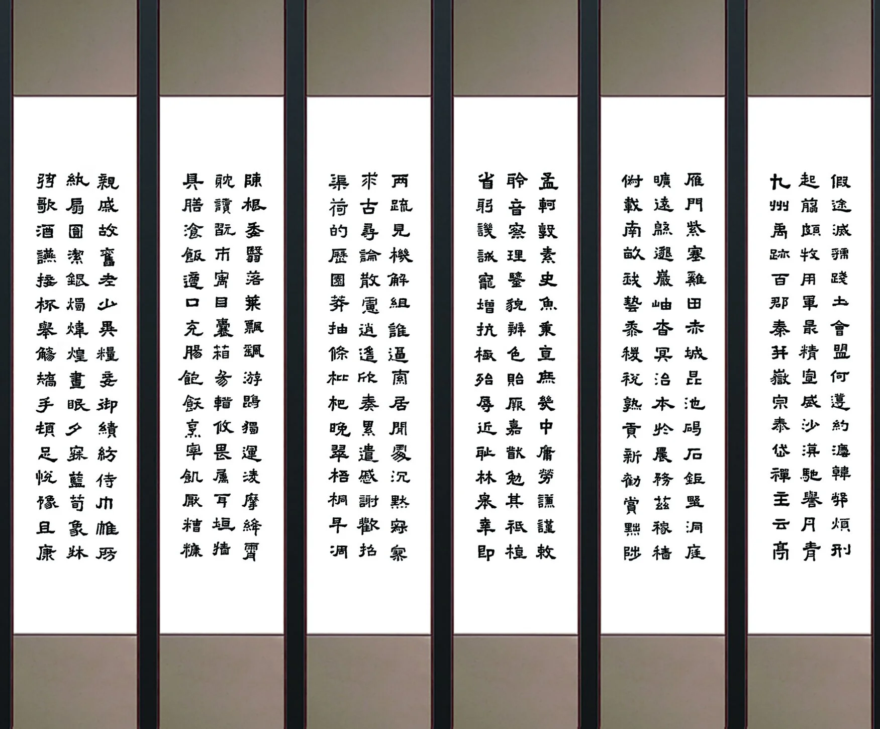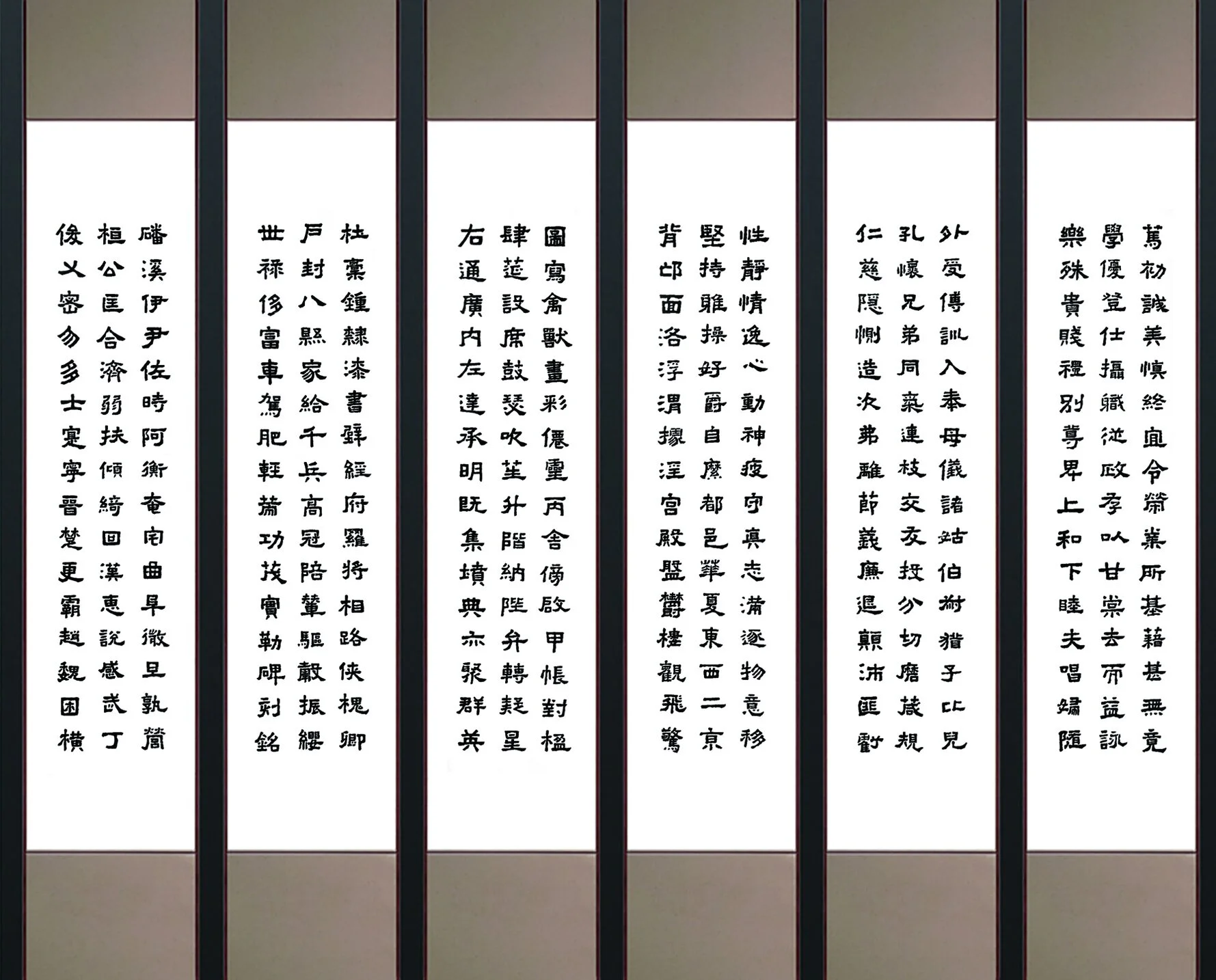 此碑林共选用作者书写的四款汉隶《千字文》书法系列:《梁小萍书西狹颂千字文》、《梁小萍书张迁碑千字文》、《梁小萍书鲜于璜千字文》和《梁小萍书衡方碑千字文》。它们均为书史首创。