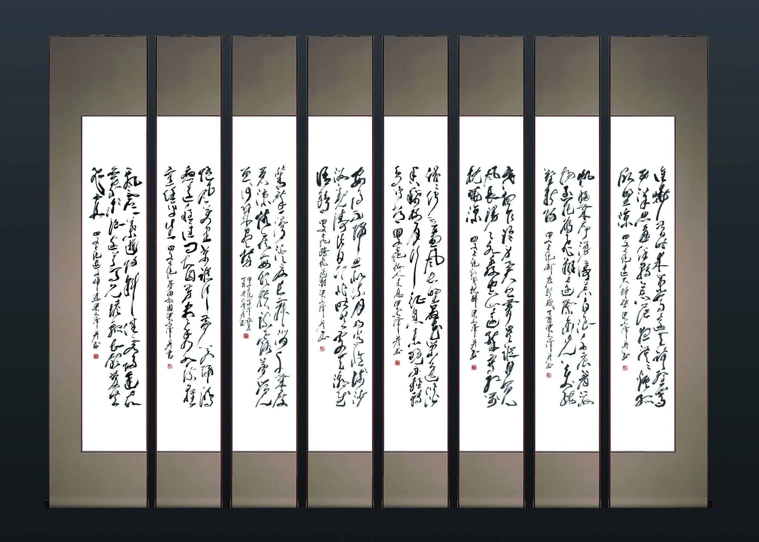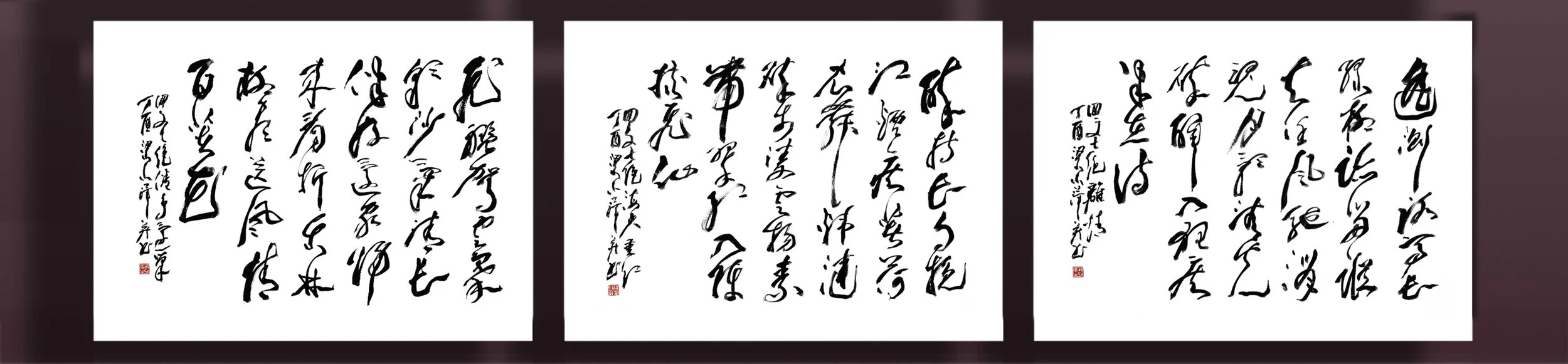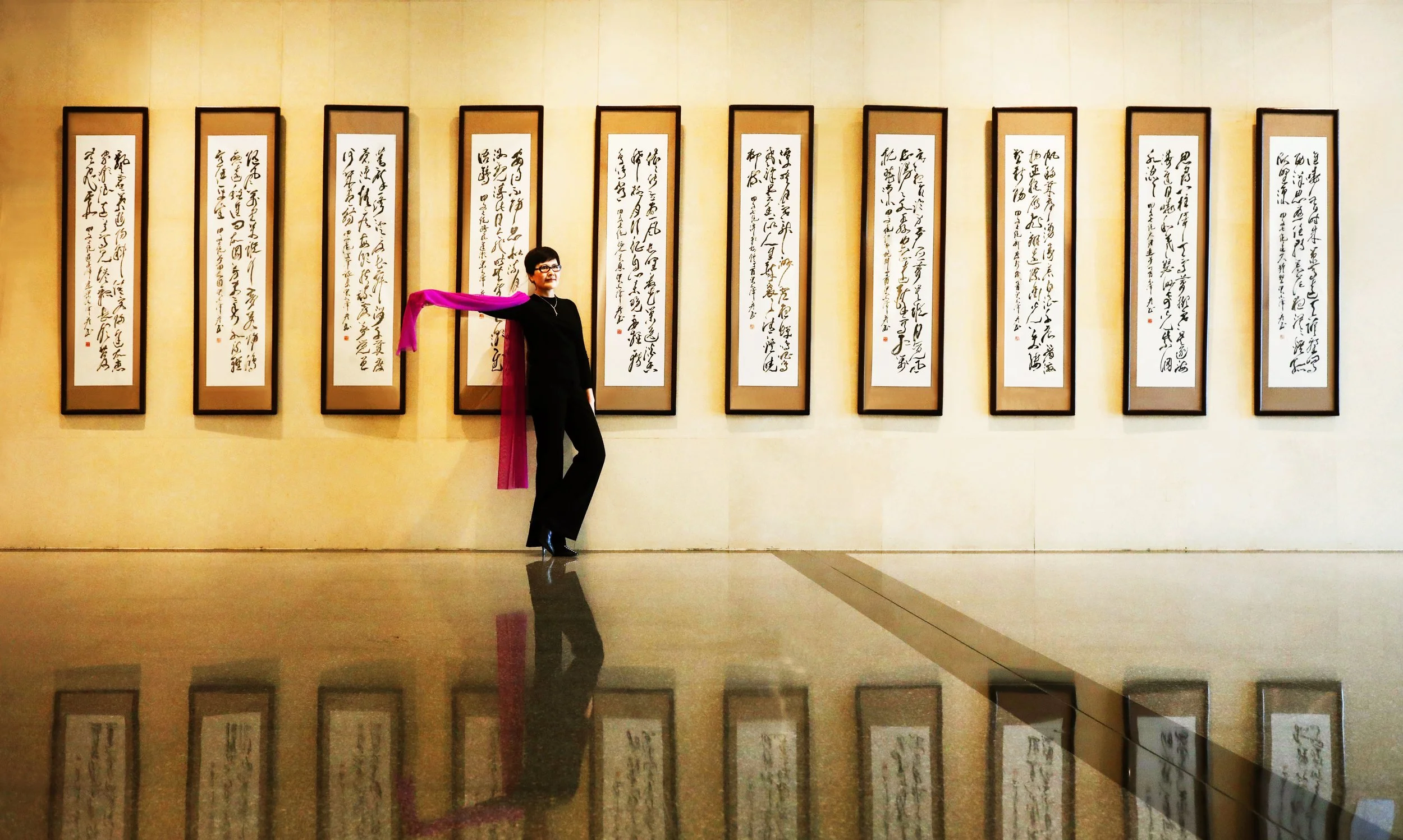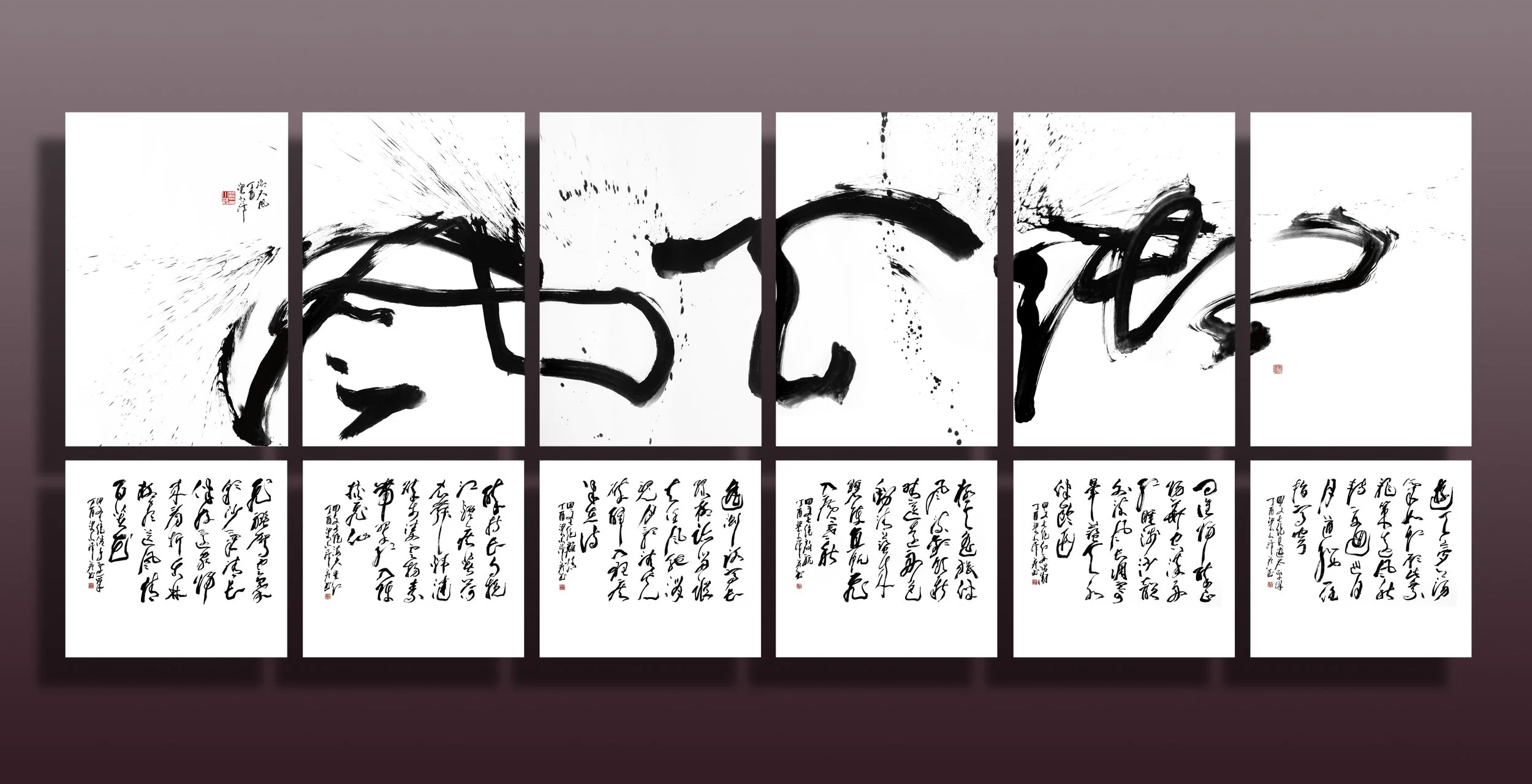 当作者甫进大厅,瞬间被竖挂和横挂的两帧十二尺半开书法和国画气势所震撼,一种朦胧的感觉开始清晰:她刚在史丹福大学即席表演的也是十二尺整纸作品,正是这“十二尺”,成为他们之间的相识密码。