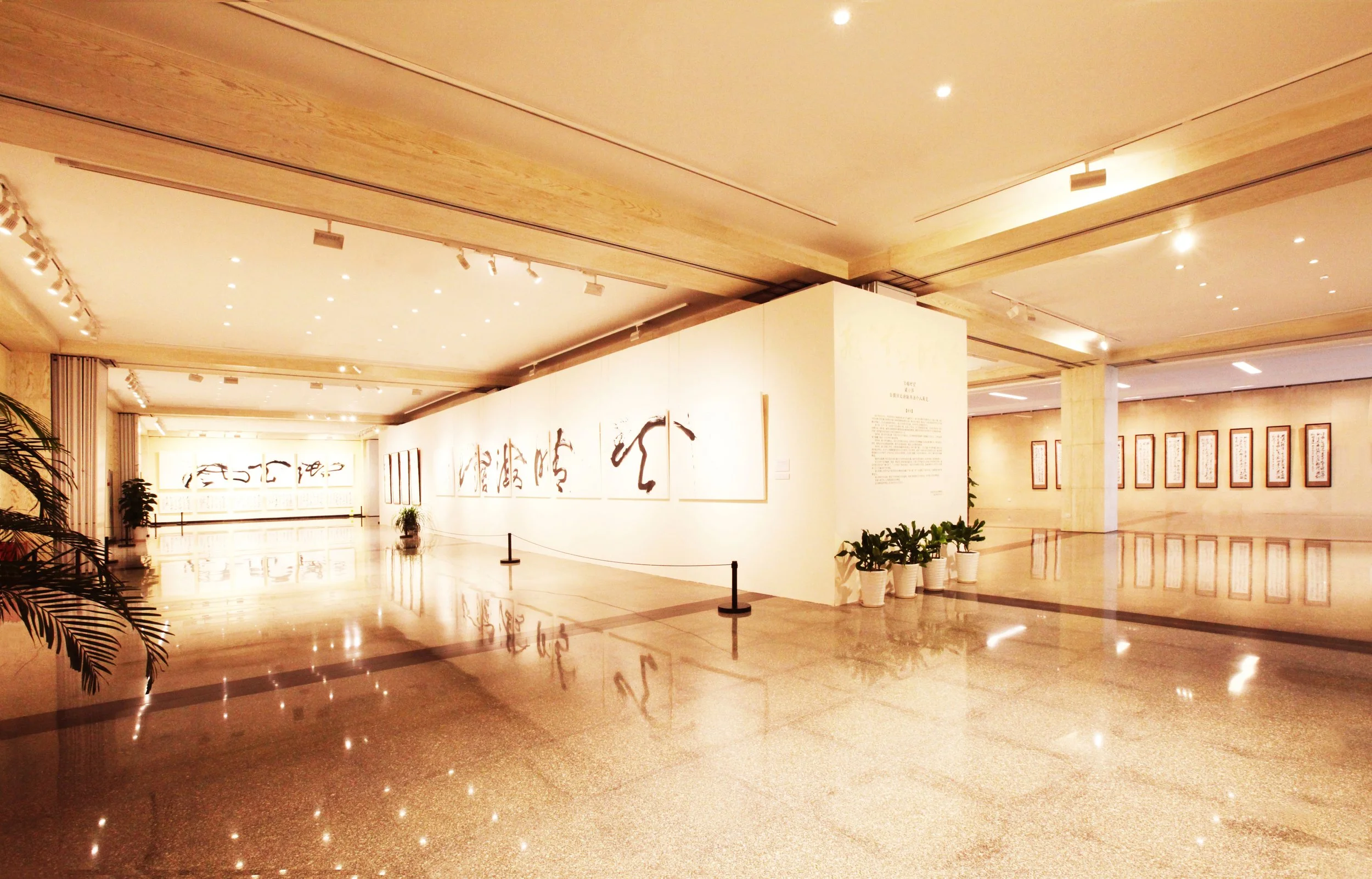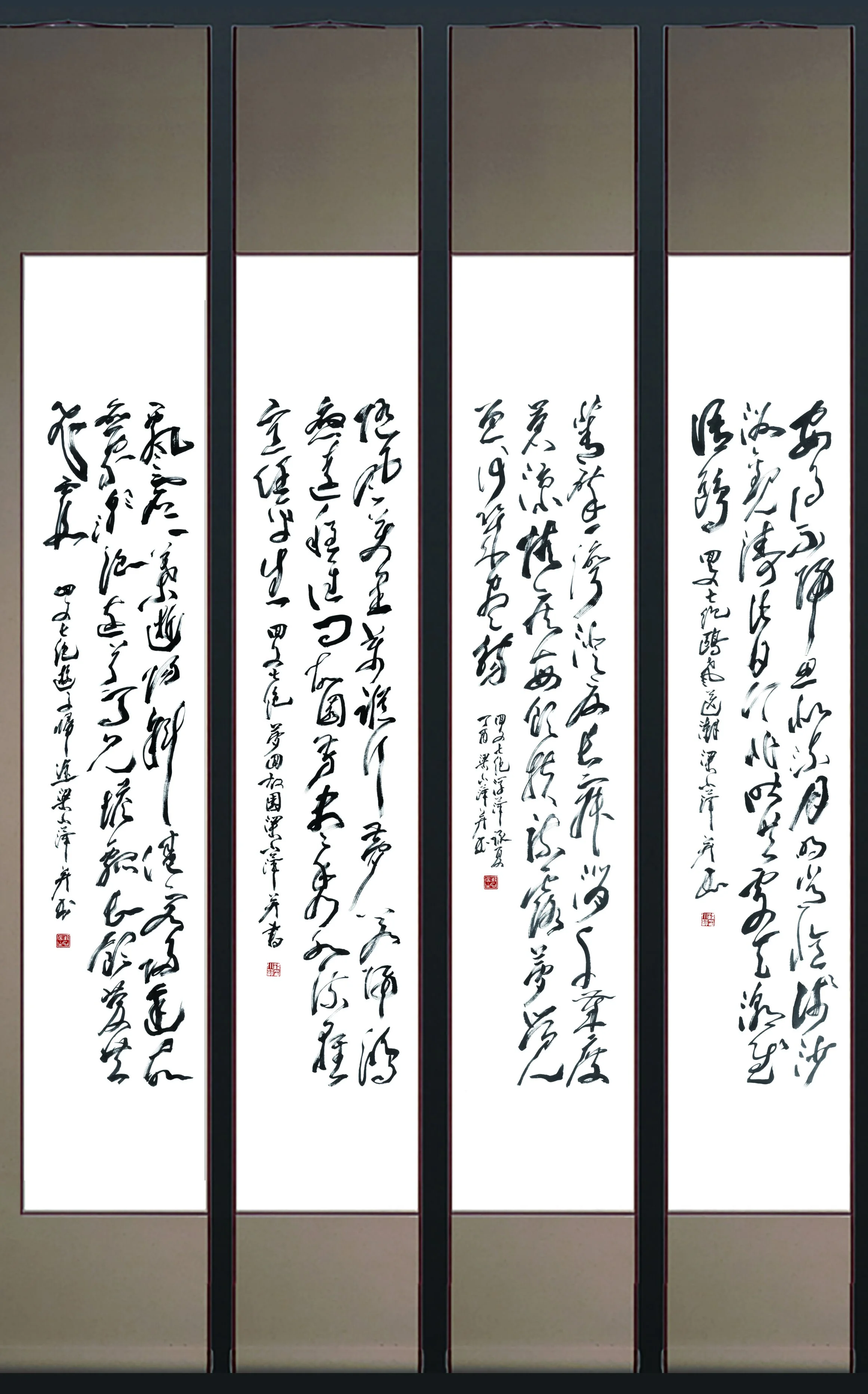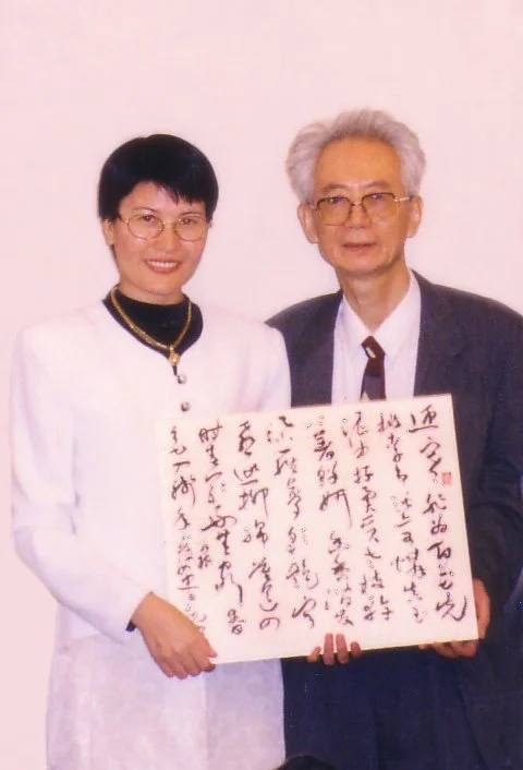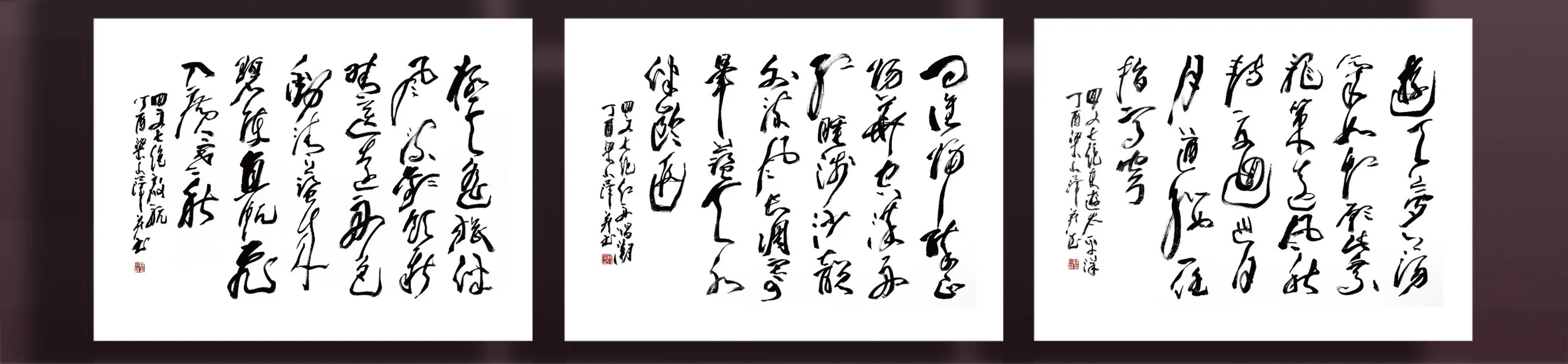 当作者甫进大厅,瞬间被竖挂和横挂的两帧十二尺半开书法和国画气势所震撼,一种朦胧的感觉开始清晰:她刚在史丹福大学即席表演的也是十二尺整纸作品,正是这“十二尺”,成为他们之间的相识密码。