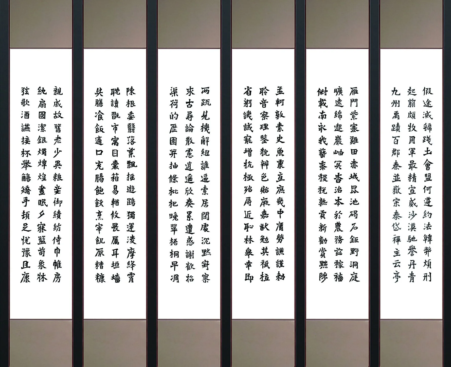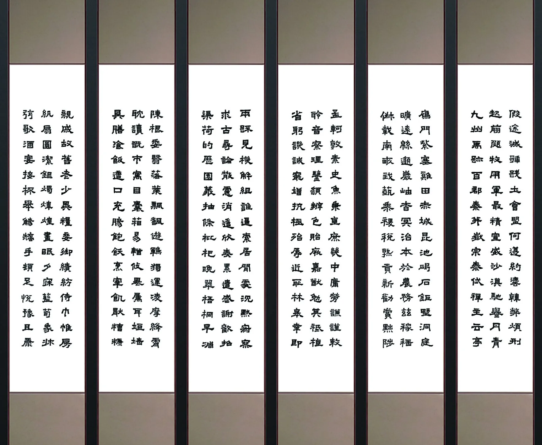 此碑林共选用作者书写的四款汉隶《千字文》书法系列:《梁小萍书西狹颂千字文》、《梁小萍书张迁碑千字文》、《梁小萍书鲜于璜千字文》和《梁小萍书衡方碑千字文》。它们均为书史首创。