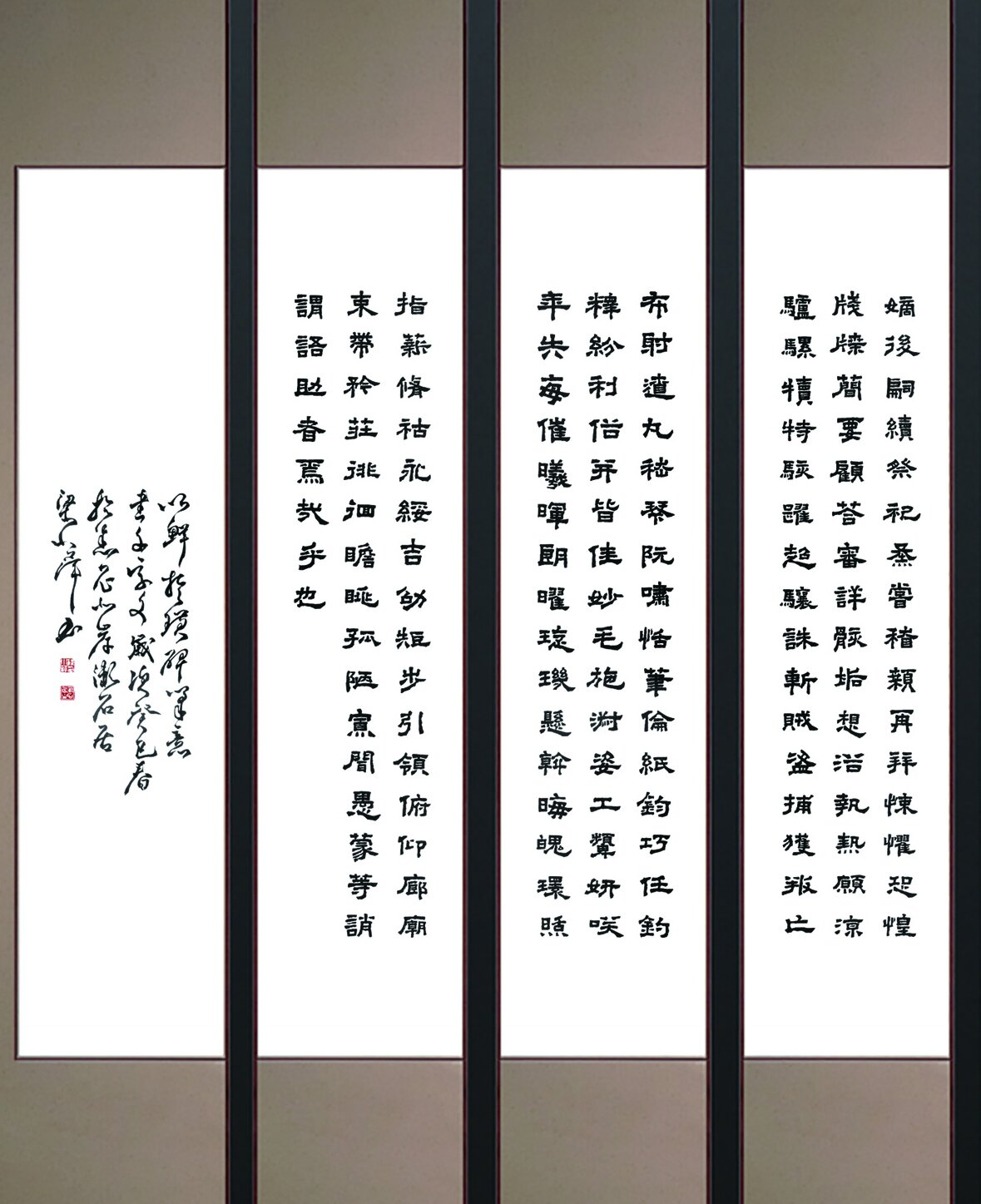 出于避免与其它楷书大家在历史上已有《千字文》书法重复的考虑,碑林在此选用了作者上面四款《千字文》系列。从中,可较为直接地感受到作者的“梁氏自创笔法”的应用,以及一窥作者在篆书、隶书作品中所呈现的淳厚之风和刀刻之力的根源。