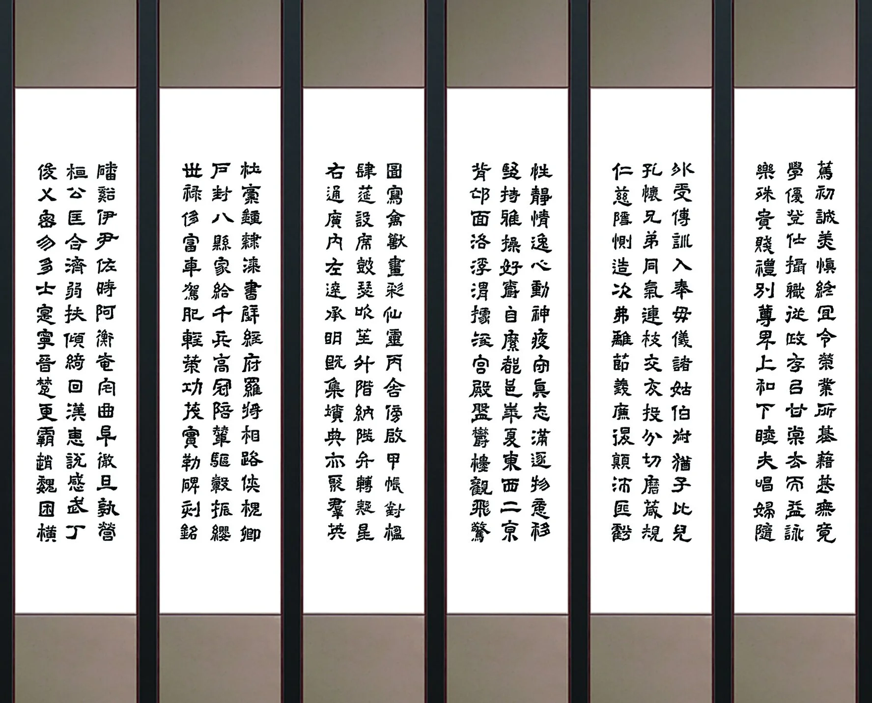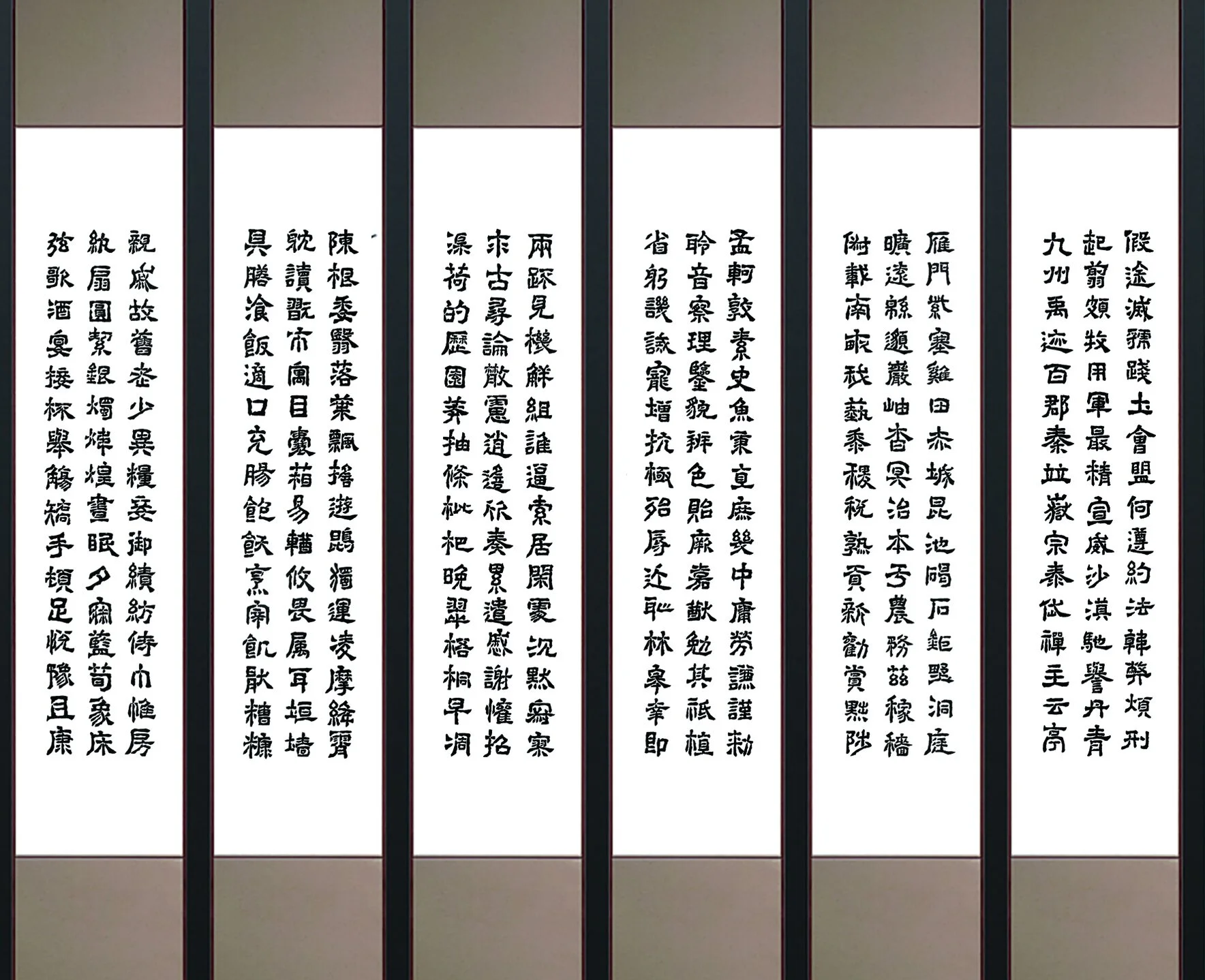 此碑林共选用作者书写的四款汉隶《千字文》书法系列:《梁小萍书西狹颂千字文》、《梁小萍书张迁碑千字文》、《梁小萍书鲜于璜千字文》和《梁小萍书衡方碑千字文》。它们均为书史首创。