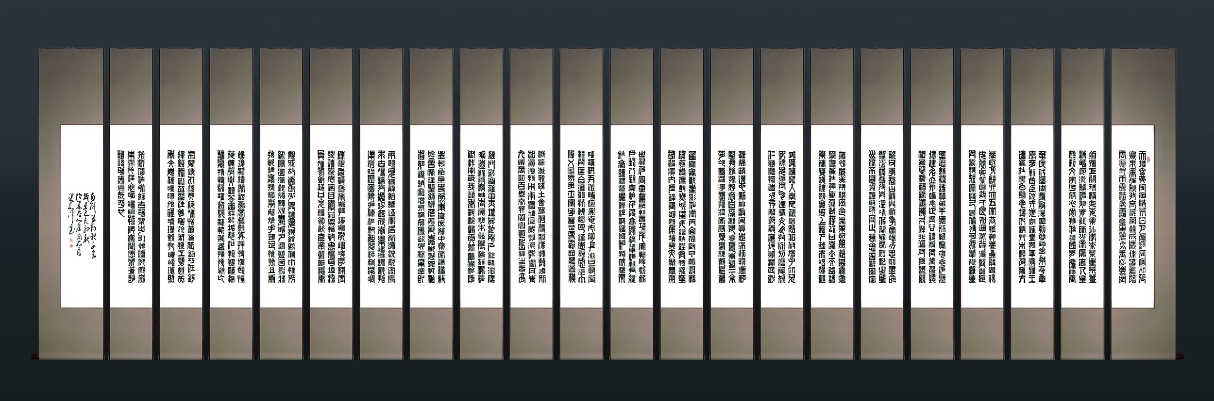 在该书体中,作者把篆刻的审美意识融入书法,通过娴熟的毛笔书写技巧,把笔法转为刀法,同时吸取篆刻的章法精髓,创出自己独特的书体风格,形成有行无列,气势穿行透列而生;虚实相生,笔趣演练在刀斧之间;平险方园,神韵流淌在肃穆与灵动之中。把方寸中的妙境,扩大到一片广阔的空间,达到一种奇特的艺术境界。