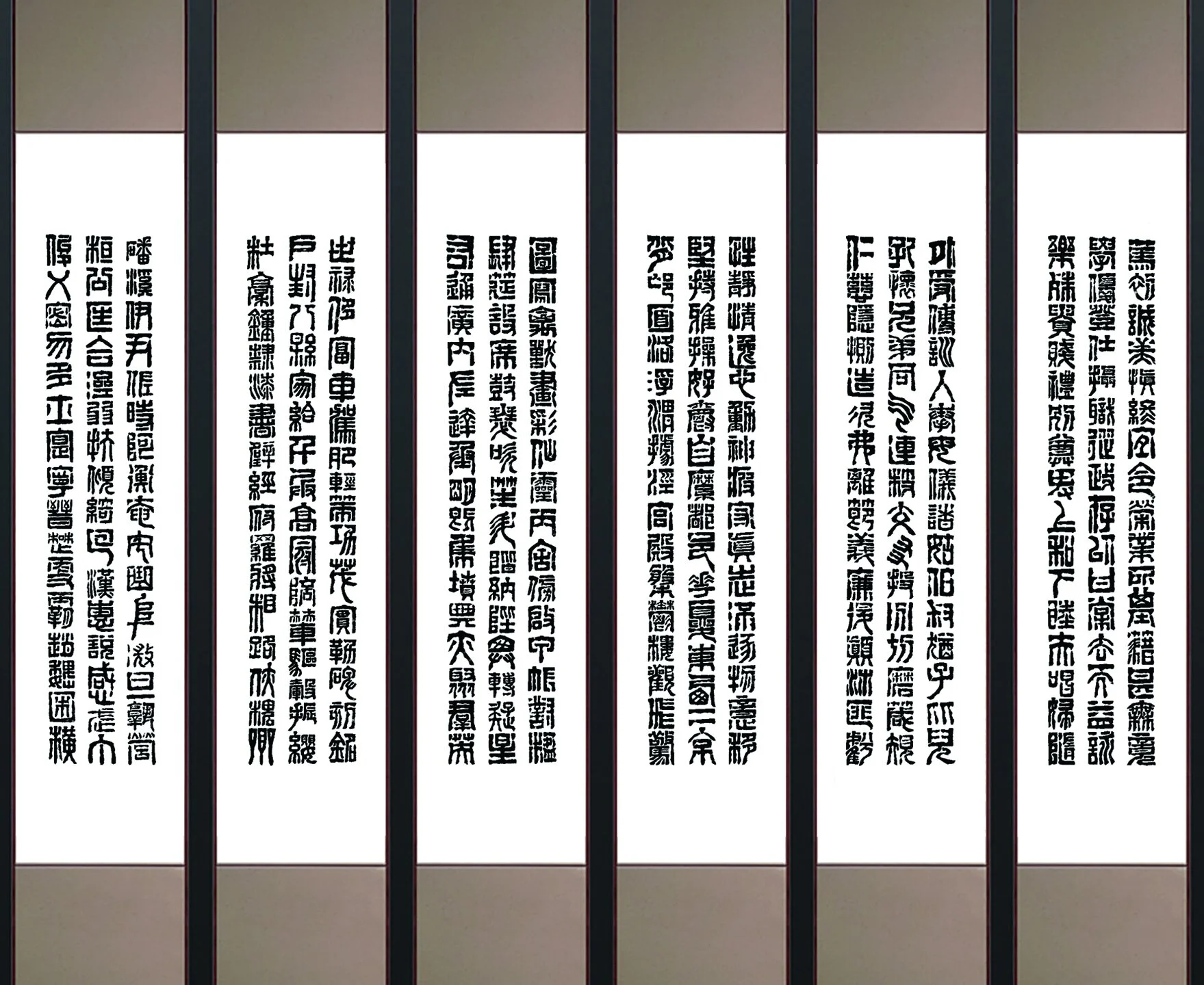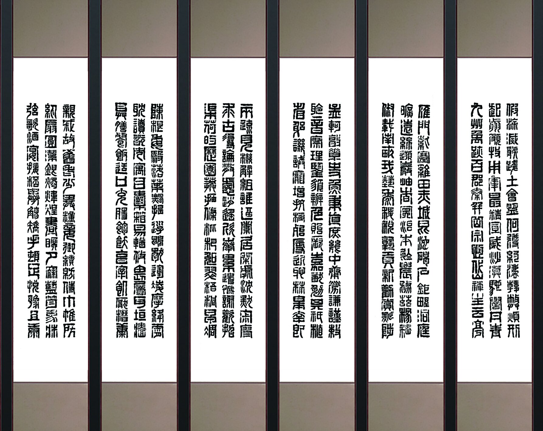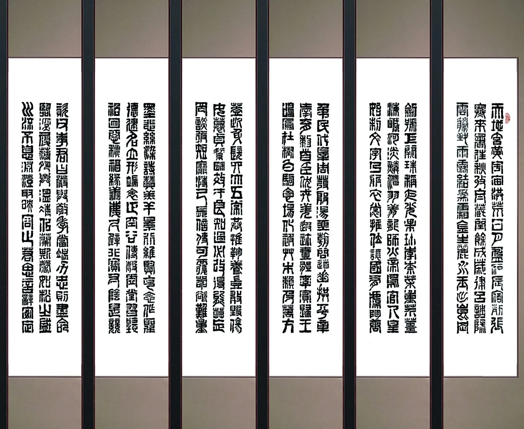 在作者现已完成的60款《千字文》中,有包括了从商朝甲骨文到秦朝小篆的11款篆书。《梁小萍自创篆刻体千字文》正是这些篆书《千字文》的艺术累积和对篆刻偏好的一种蜕变。该书体扩大了书法审美的范围,丰富了书法艺术的内涵。